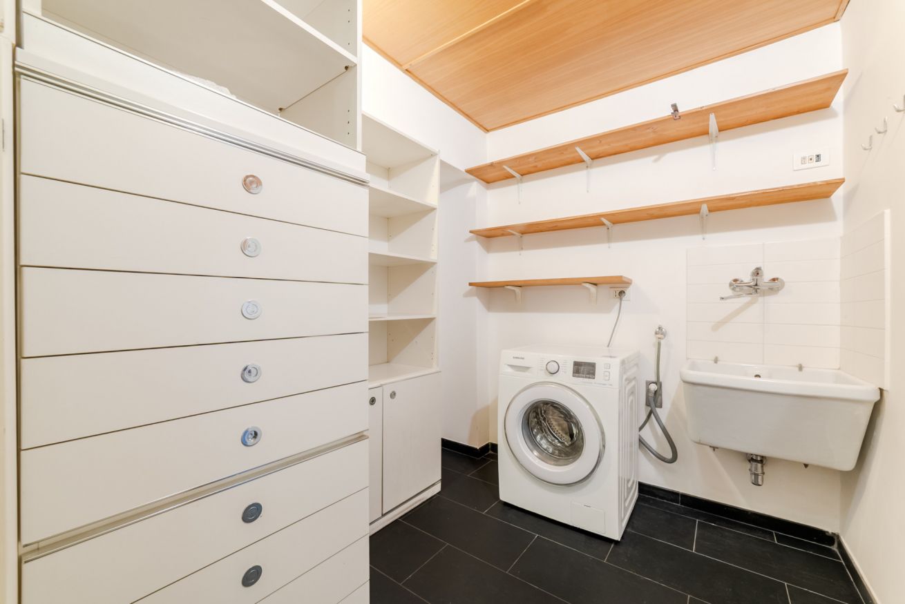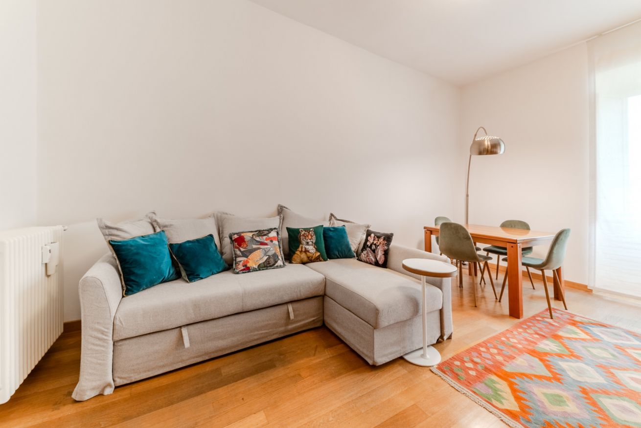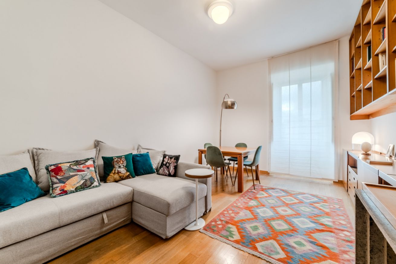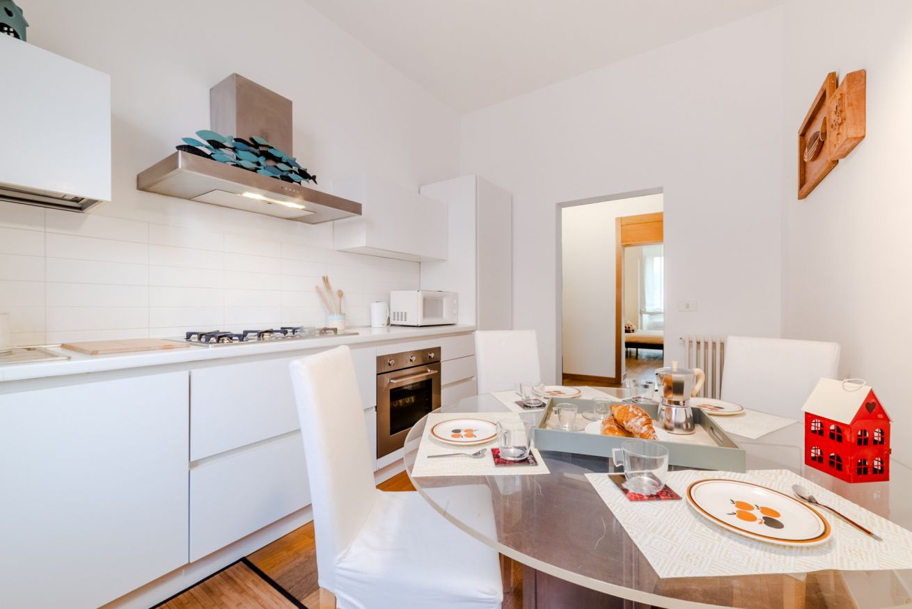 L’appartamento è composto da due ampie camere da letto matrimoniali, un confortevole soggiorno con divano letto matrimoniale, una moderna cucina completamente attrezzata e un grande bagno accessibile sia da una delle camere da letto che dalla stanza adibita a lavanderia.